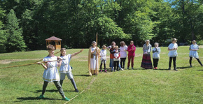 De vijfde klas van vrijeschool Divosvid uit Kharkiv viert hun Olympiade met zelfgemaakte speren in West-Oekraïne.